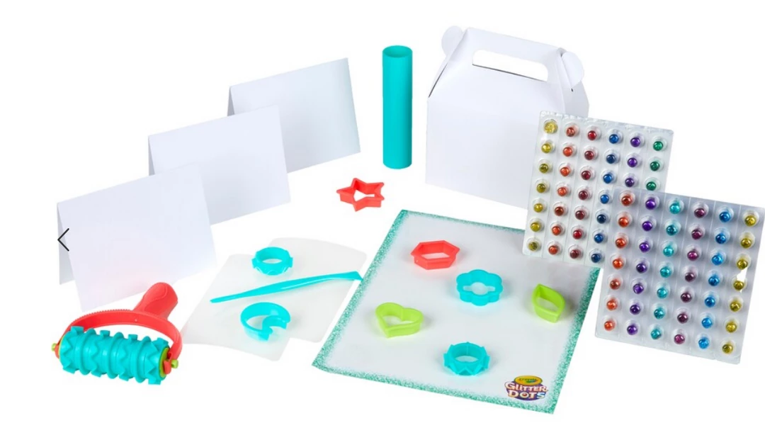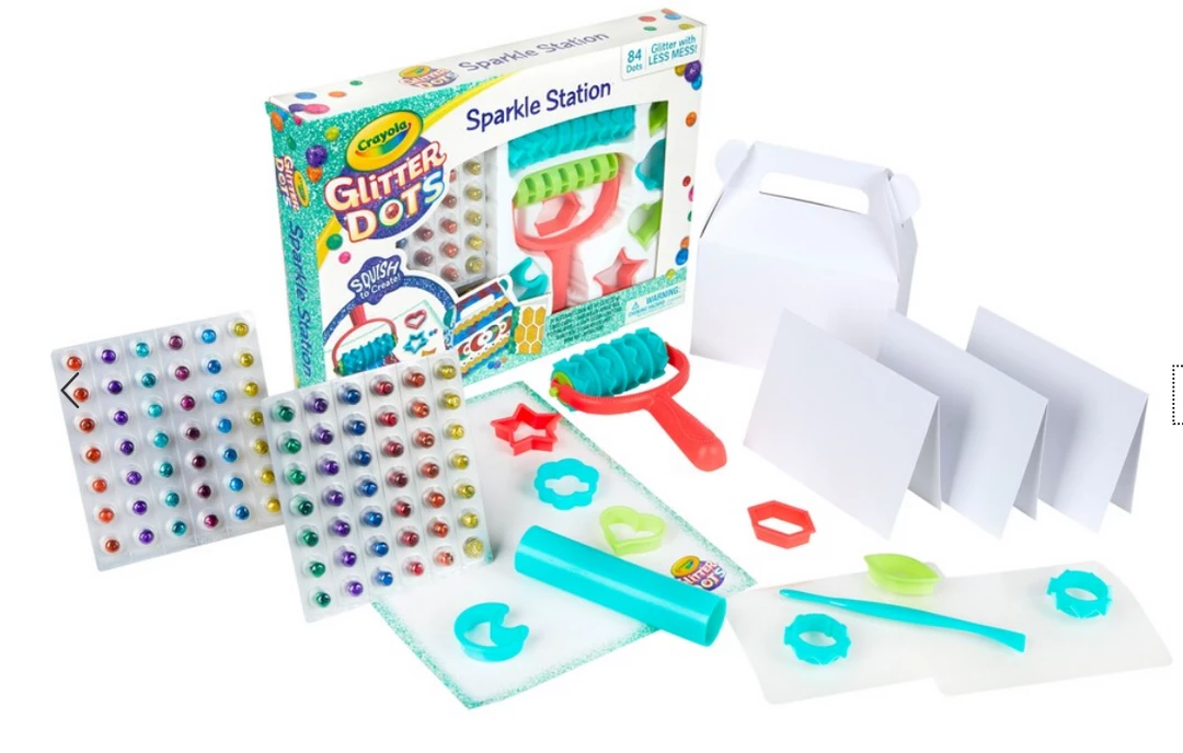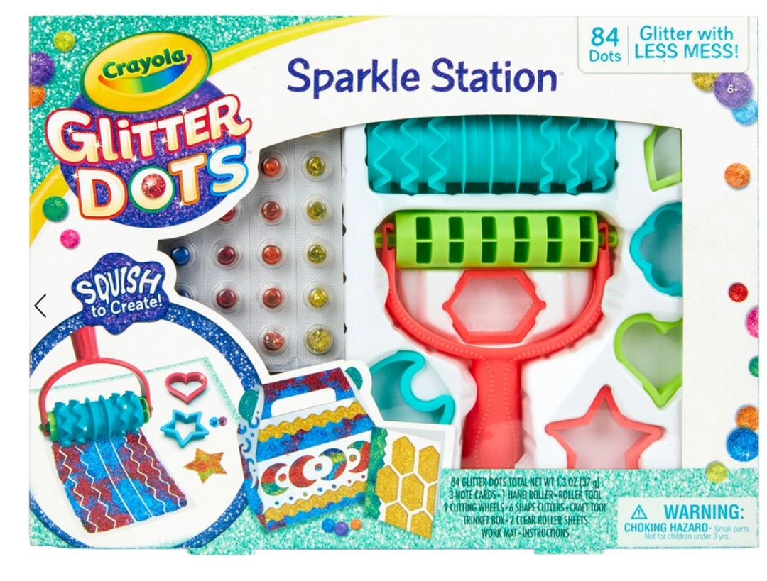 Crayola’s Glitter Dots are an innovative glitter-infused dot that sticks to a variety of surfaces to make sparkly designs.
