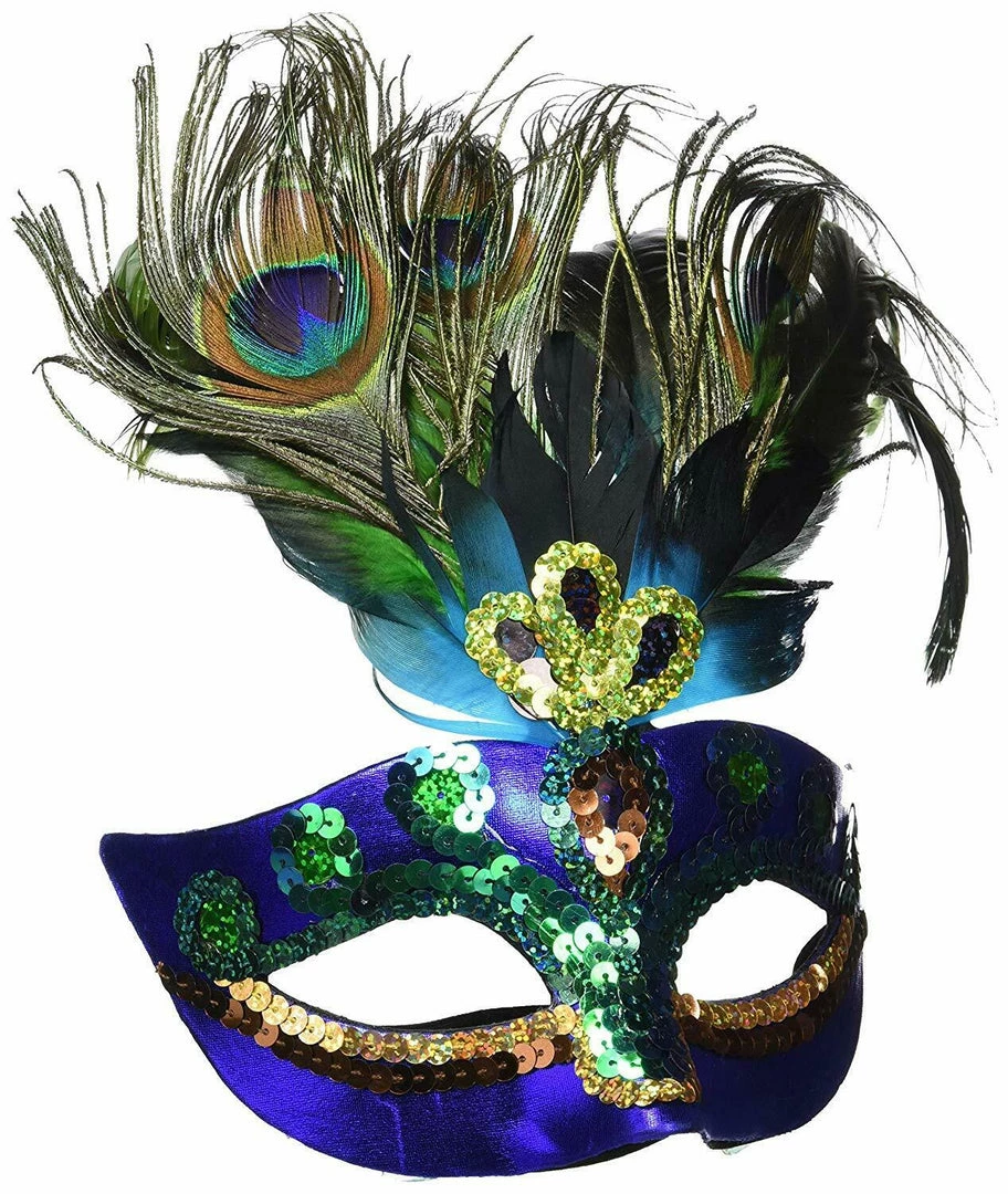 Add our Peacock Feather Mask to your Halloween costume for a bit of mystery! Features a royal blue satin mask with sequins and peacock feathers. Elastic band for easy and comfortable wear! One size fits most teens and adults.ย