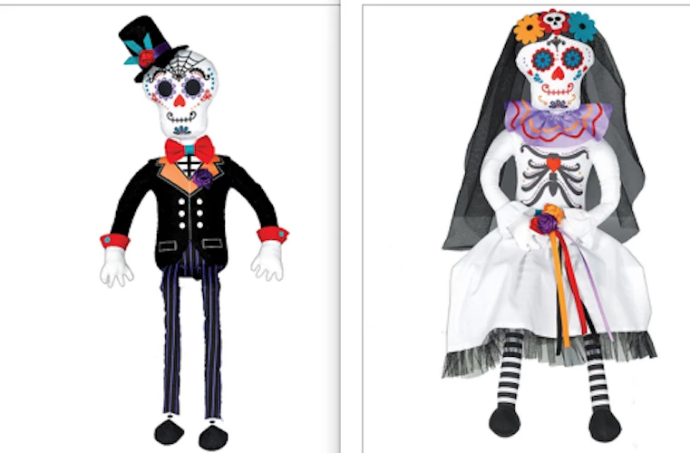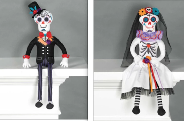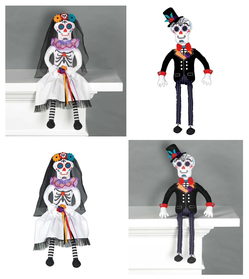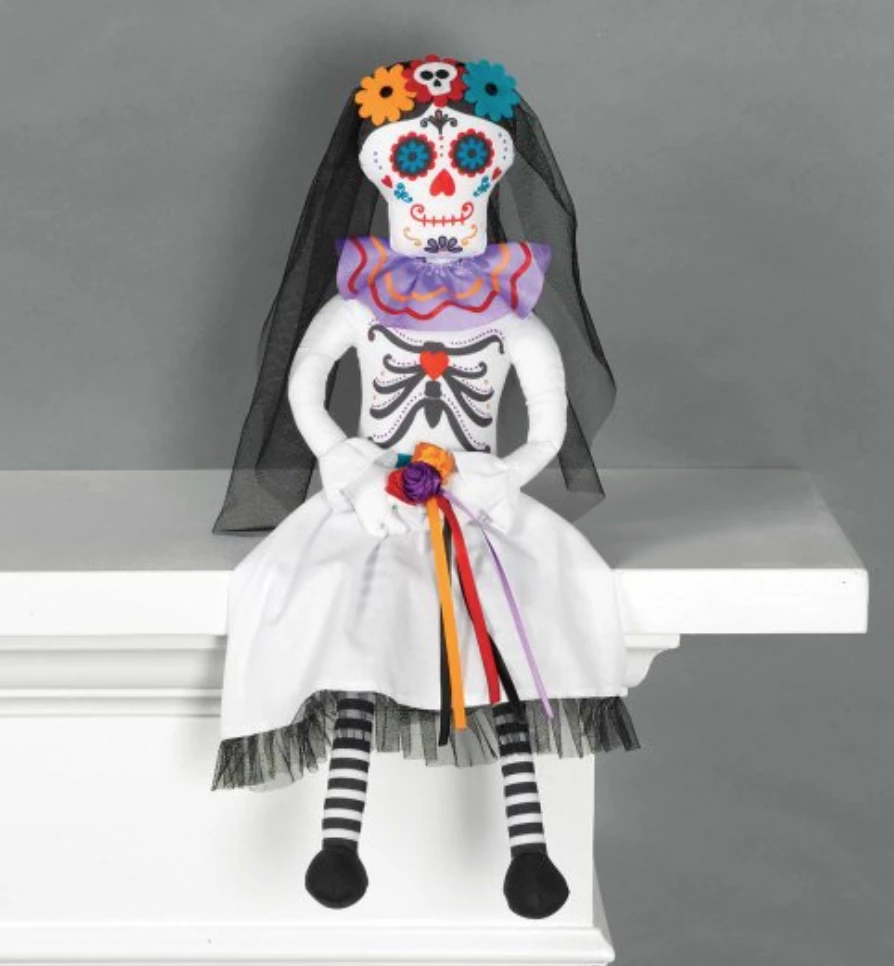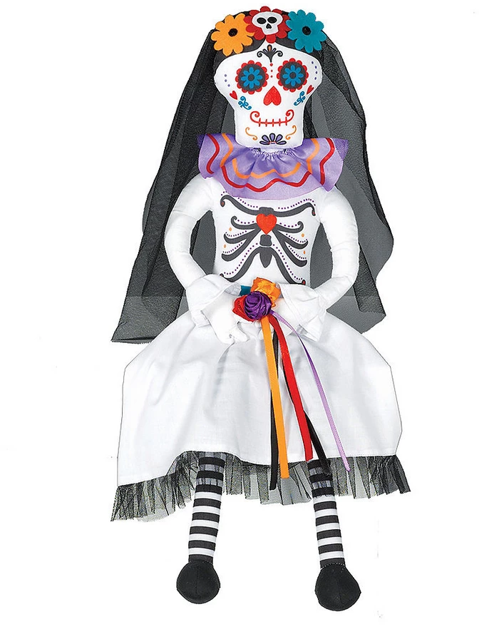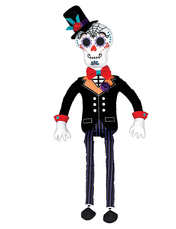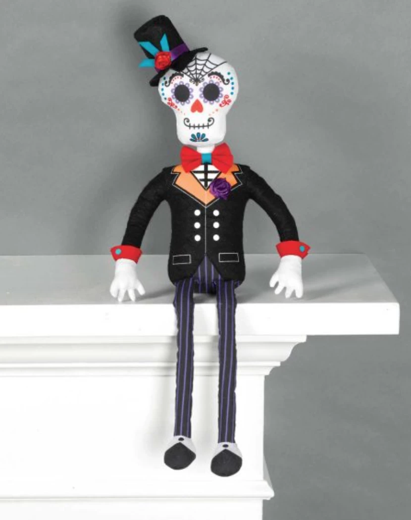 The sitting doll decoration looks like a sugar skull wearing a black suit and top hat with colourful details. Use this Sitting Day of the Dead Groom Doll to decorate your mantle, bookshelf, or anywhere else in your house for your Day of the Dead celebration!