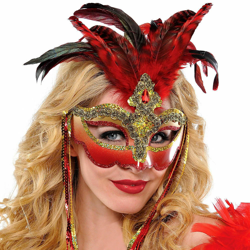 You’ll look elegant at the masquerade ball in a red feather mask! This ornate Venetian mask features oversized black and crimson genuine feathers attached at the top. A bright red gemstone takes center stage on the forehead, and gold sequins around the eyes match the sequin tassels attached to the sides. Pull the elastic band over your head for a secure fit.