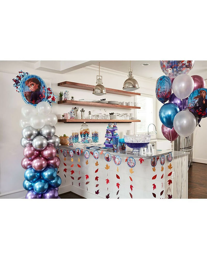 Elsa is back again and has teamed up with her sister Anna and friends on a grand adventure in the next upcoming Disney film Frozen 2. Celebrate the release of the new film and complete your Frozen 2 themed party with these Disney Frozen 2 Hanging String Decorations. The decoration features cardboard circle cutouts of Olaf, Elsa and Anna attached to a white piece of string, with an autumn leaf separating each circle. Hanging from each of the character cutouts is a string of 5 autumn leaves of different shapes and colours. Combine with our range of Frozen 2 party supplies including party cups, party plates, tablecovers and more.