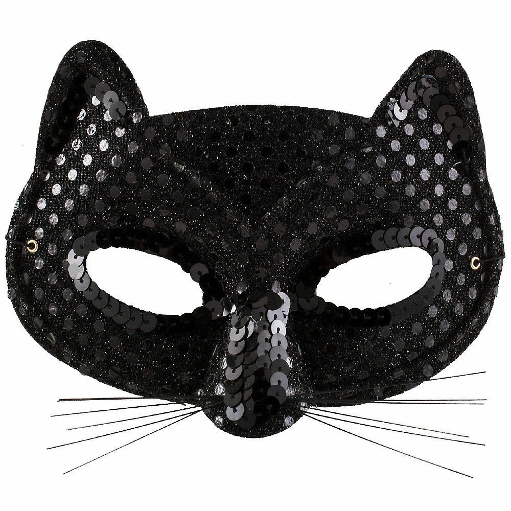 Talk about the cat’s meow! This cute Black Sequin Cat Mask is layered in black sequins with black sequin trim detail. It has ears extending from the top and black whiskers attached to the nose. An elastic band holds this glitzy masquerade mask in place.