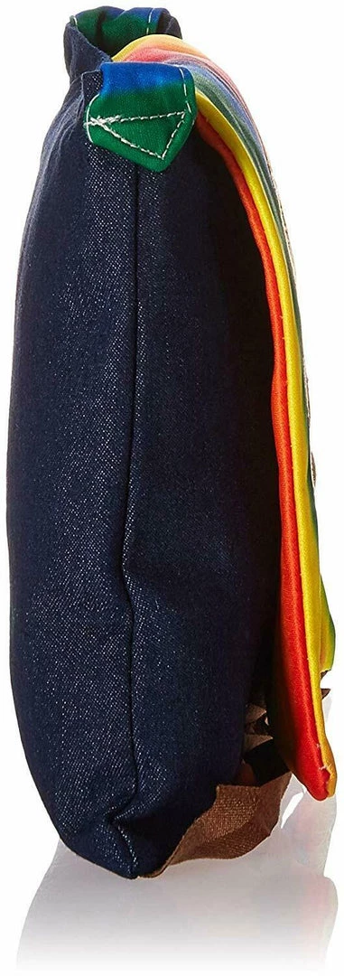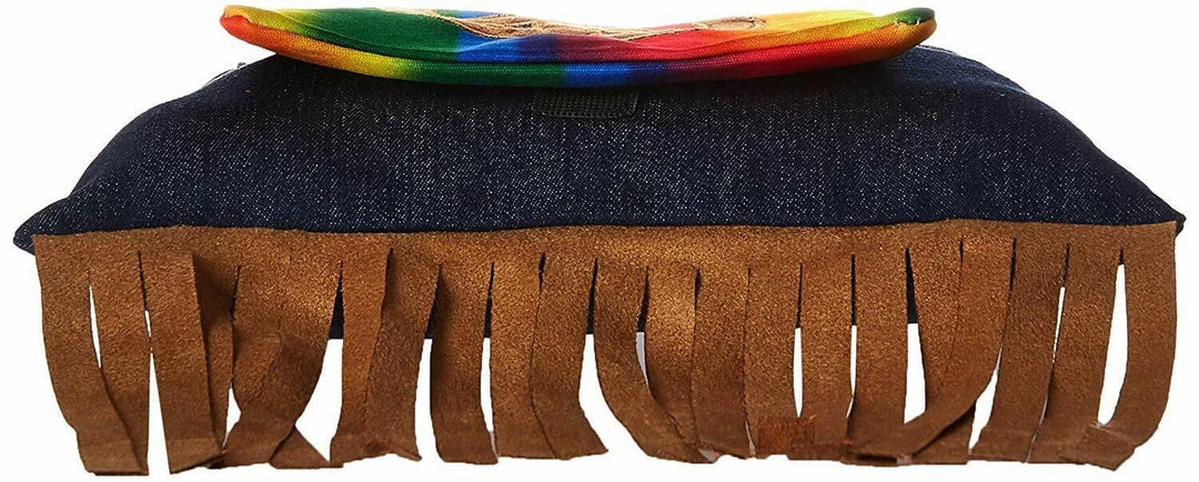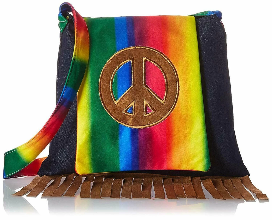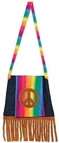 - Hippie hand bag features psychedelic peace design print on a polyester black bag with brown fringe