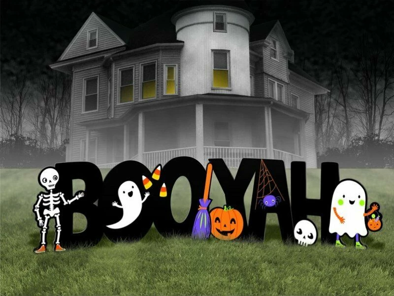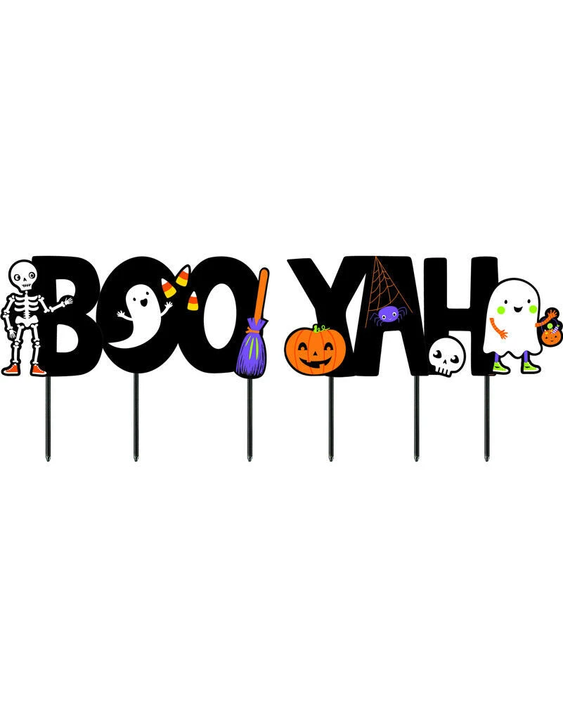 Give your ghouls and goblins a fun welcome to your Halloween party with this Hallo Ween Friends Boo Yah Yard Signs Pack of 6 set up in your front yard. This cute sign will have your guests jumping for joy and ready for the festivities to begin. Features black letters which spell out ‘BOOYAH’ and standing in front of them is a skeleton, friendly ghost throwing candy corn, a witch’s broom, smiling pumpkin, spider web, grinning skull and a trick-or-treating ghost. Stick them up for great photo props or backdrop.