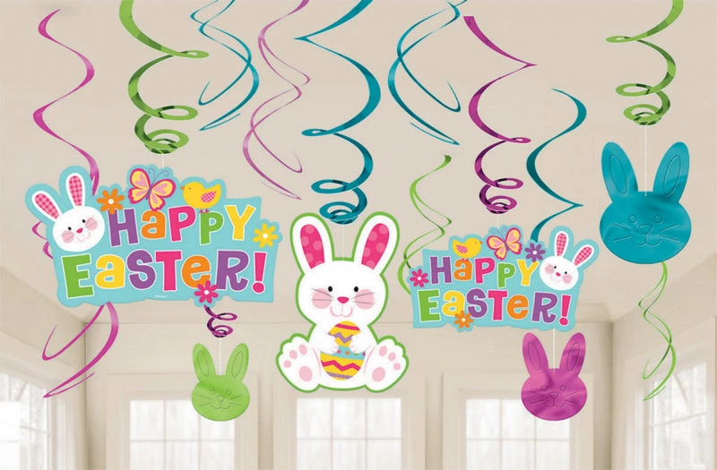 Brighten up your Easter with these colourful foil swirl decorations. This pack includes 6 plain swirls in pretty shades of pink, blue and green. The other 6 swirls each feature a cute bunny shape or a sign saying ‘Happy Easter’. Â