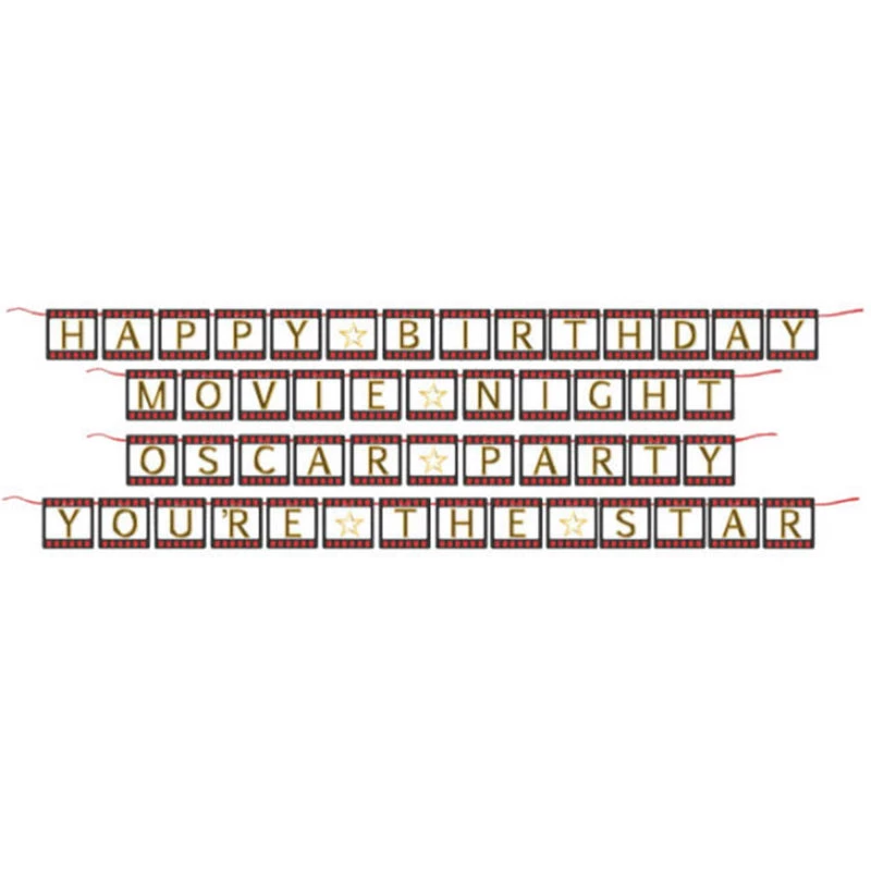 Hollywood Lights theme ribbon banner kit with letters to create 4 different messages – Happy Birthday, Movie Night, Oscar Party or You’re The Starย (each letter approx. 13cm x 13cm) – Set