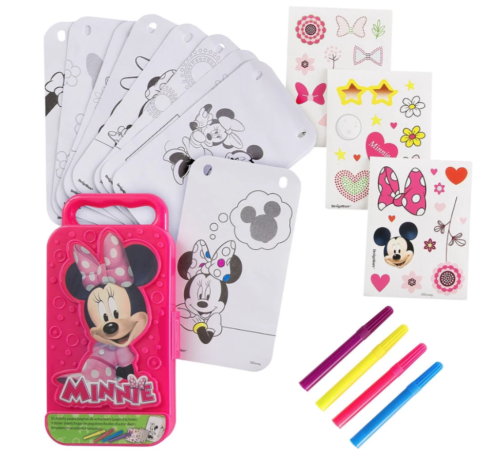This plastic Disney Sticker Activity Box features Minnie Mouse on the front. Inside are 20 colouring sheets with all Minnie Mouse all dressed up. Colour them in with the four included markers, then add some stickers for extra fun!