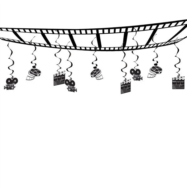 This hanging Hollywood Movie Set Ceiling decoration is a huge 12 feet long and one foot wide. Hanging down from the giant filmstrip are a dozen individual movie theme icons such as a film reel, a motion picture camera and a clapboard. Installation is simple as each dangling icon is already attached. All you have to do is hang up each end from the ceiling. Hang this movie theme decoration over the buffet, across the entrance, or over the dance floor to set the mood for your fun movie night theme event.