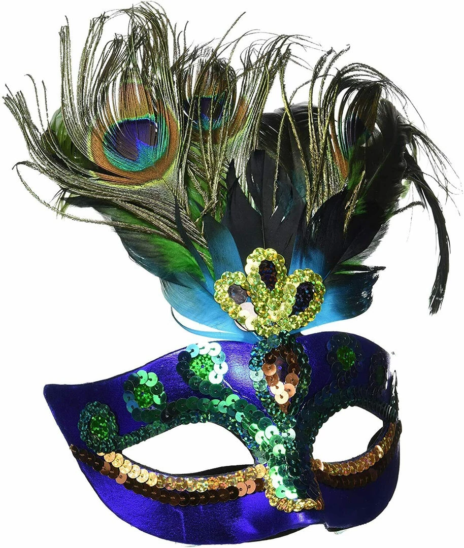 Add our peacock Feather mask to your Halloween costume for a bit of mystery! Features a royal blue satin mask with sequins and peacock feathers. Elastic band for easy and comfortable wear! One Size fits most teens and adults. Includes 1 mask per package.