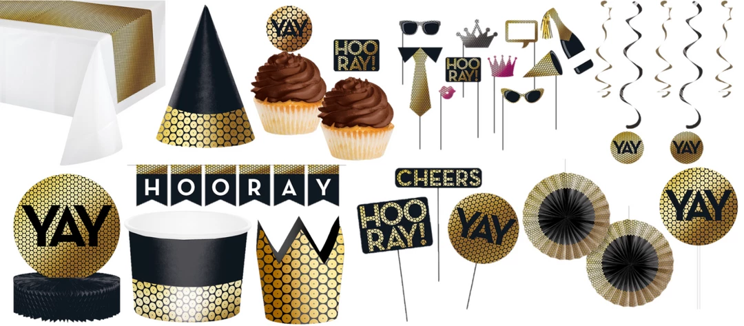 Select Gold Party Supplies to complement your YAY and HOORAYย themed celebration. Perfect for 1920s, Roaring 20s, Greatgatsby theme party as well!