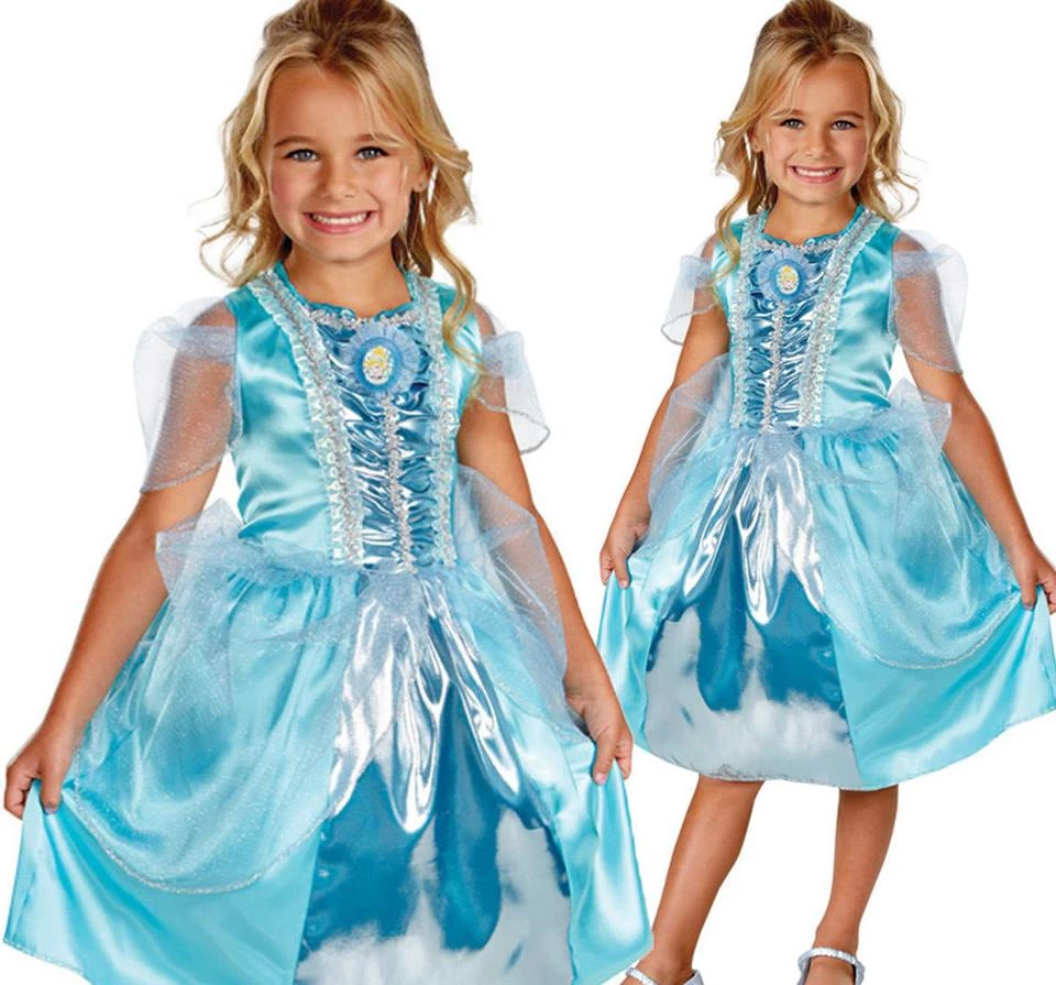 This Girls Cinderella Deluxe Costume includes: Blue dress with sparkled sleeves and character cameo at the top of the dress.