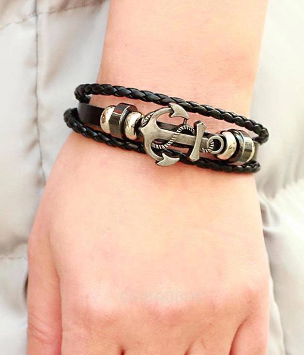 Three rows of hand-braided black leather are adorned by an exquisite anchor in stainless steel. This anchor bracelet for men has a seafaring appeal while the anchor adds elegance and sophistication to the piece, making it a great accent for both dressy and casual looks.