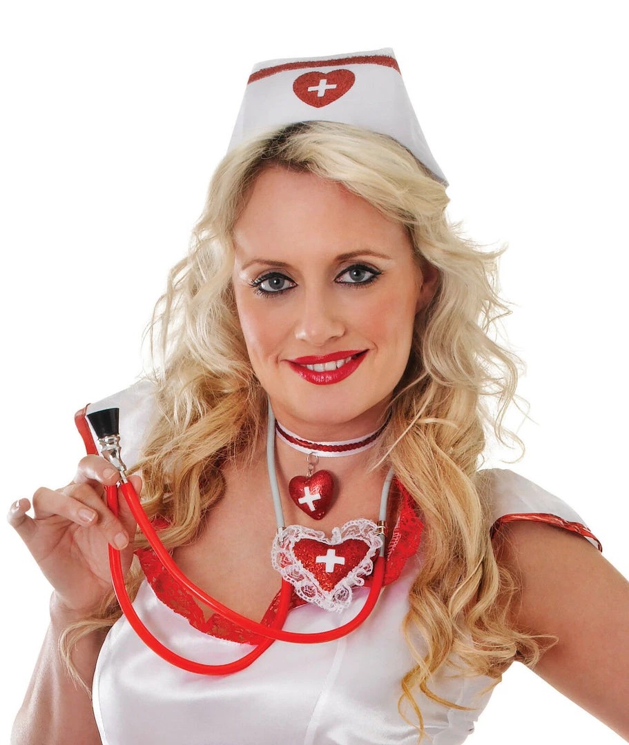 - Stethoscope made of red and white plastic with lacy heart applique.