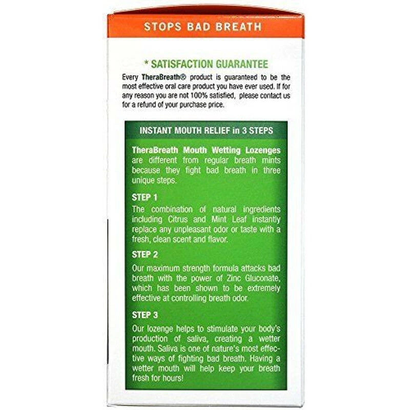 TheraBreath Mouth Wetting Lozenges are affective in eliminating bad breath, including strong food odors such as garlic and onion, Morning Breath, and smoker’s breath. Millions of people rely on TheraBreath products to stop bad breath every day.