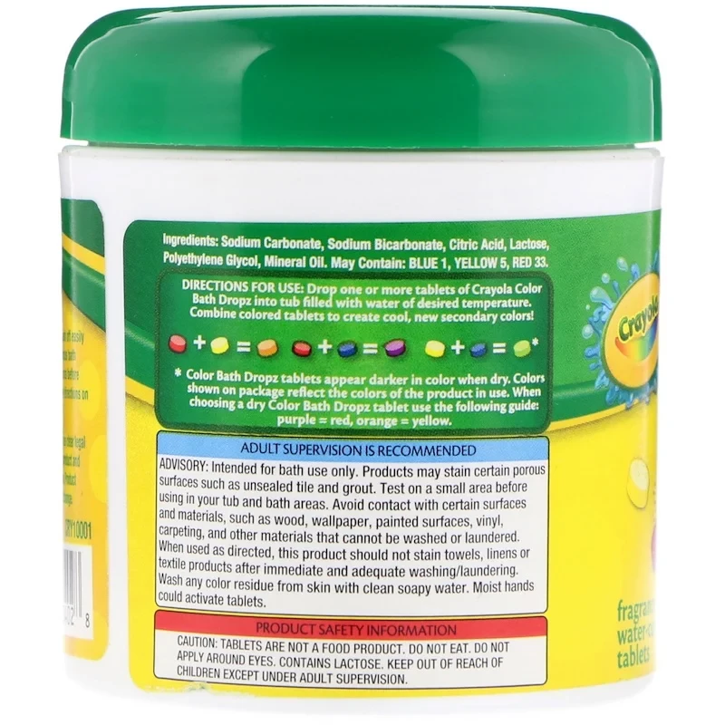 Drop one or more tablets of Crayola Color Bath Drops into tub filled with water of desired temperature. Combine colored tablets to create cool, new secondary colors!