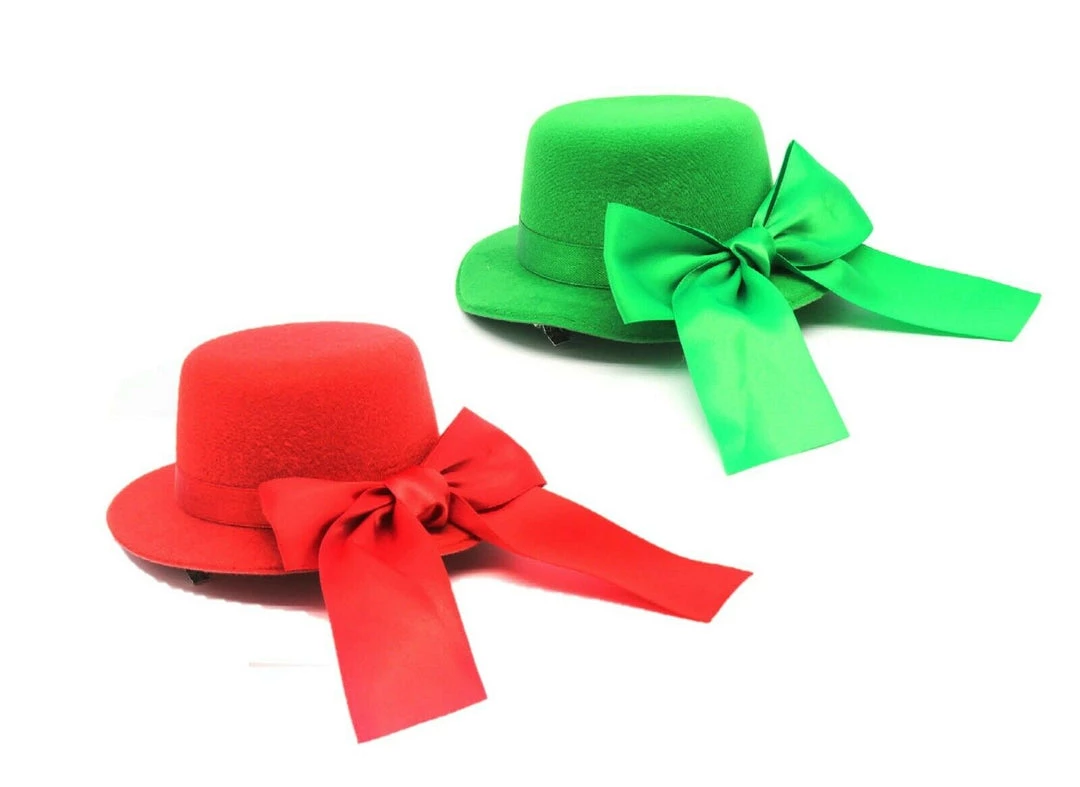 Dress to impress when you accessorise with ourย Small Red/Green Hair Hat with Ribbon! This dainty little head piece has two clips to easily fix into hairย and stays in place. Great for dance costume accessories and as a pretty fascinator for the races! Great for Christmas costume or party accessory as well!