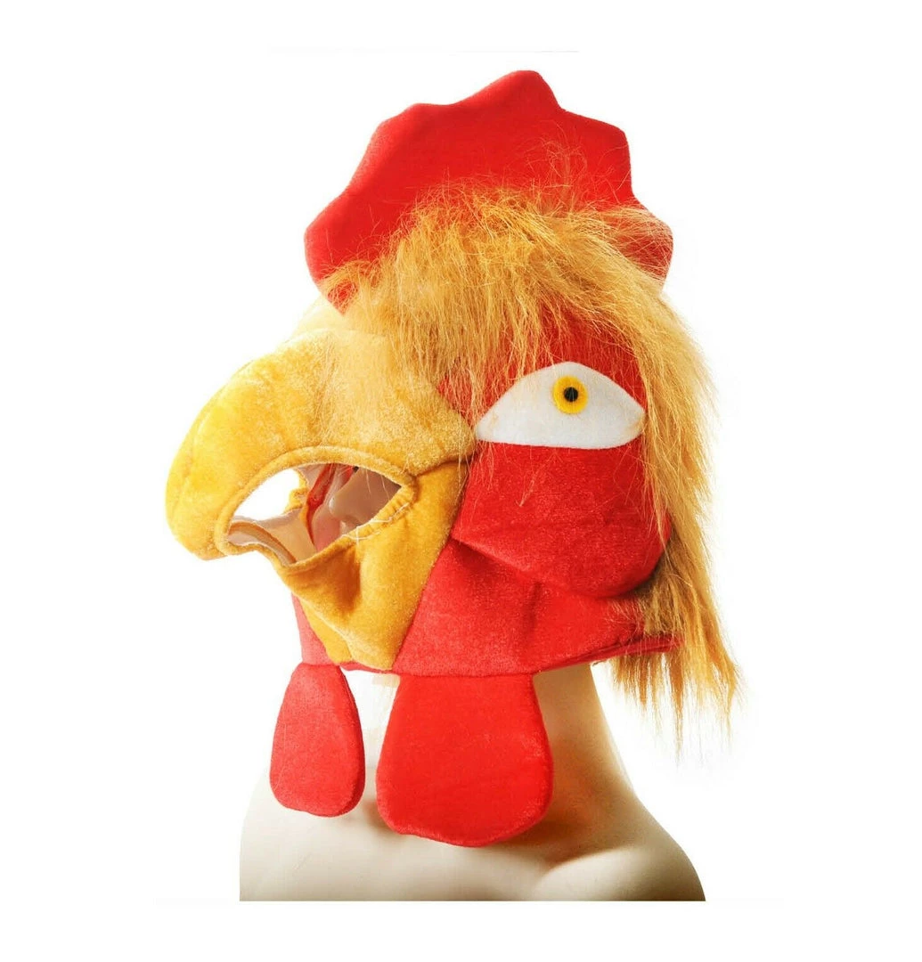 Whatever the occasion, this Plush Rooster Hat is sure to complete your look. This headpience will allow you to get a little clucky with a partially masked identity. Our Plush Rooster Hat Headpiece includes a soft furry plush overhead mask with velvet crown, eyes, bib and beak details. There is an opening inside the beak for the wearer to see from.- One Size Fits Most Adults and Teens.