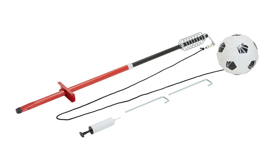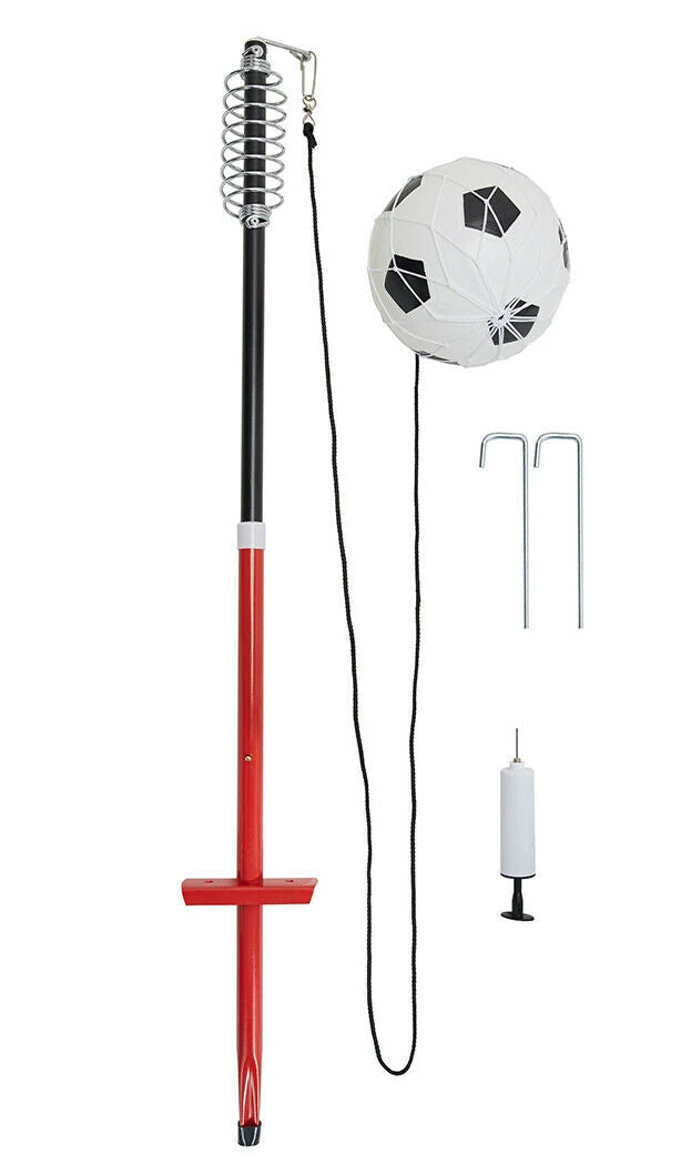 - Includes 1 x 8-inch (PVC) pre-assembled soccer ball, 1 x top pole with coil and rotating arm, 1 x base pole with foot stirrup