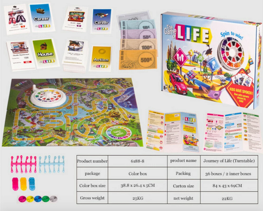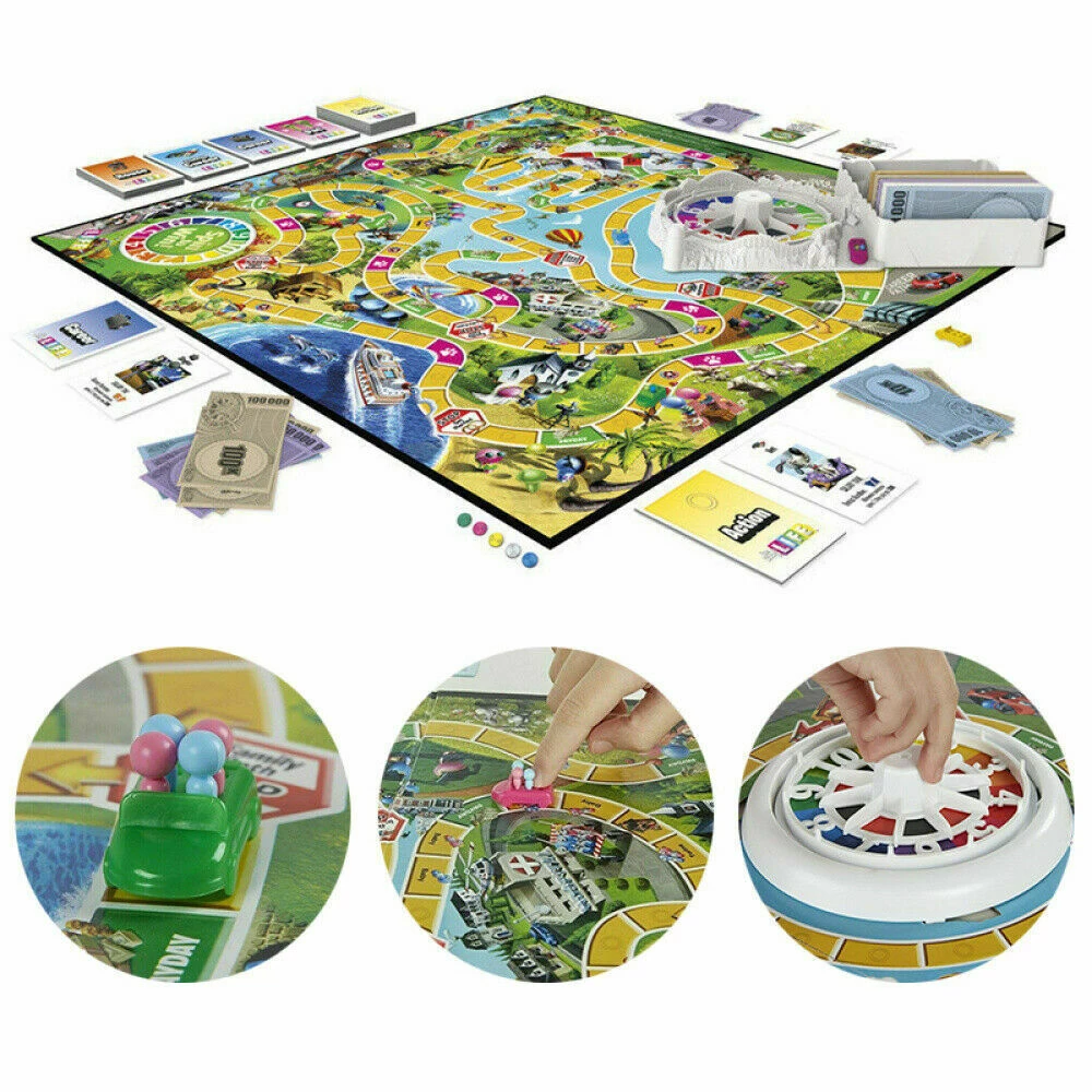 In The Game of Life game players can make their own exciting choices as they move through the twists and turns of life. Move the car token around the game board from Start to Retirement, and experience unexpected surprises related to family, career, dream vacations, and other milestones of life. The player with the most money at the end of the game wins!