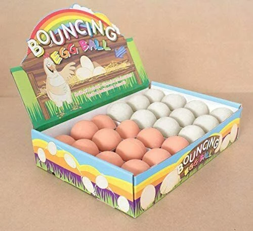 Set of 24 realistic fake rubber bouncing eggs. Imitation eggs that can be used for pranks, party gifts, goodie bag fillers, and much more. Made of durable rubber for long lasting balls. Bouncy eggs are about 2″ in size, just like a normal sized egg. Colors are the same as regular real eggs.