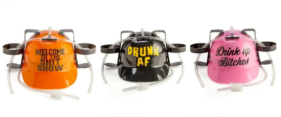 - Pink beer helmet with “Drink Up B*tches” in elegant script font
