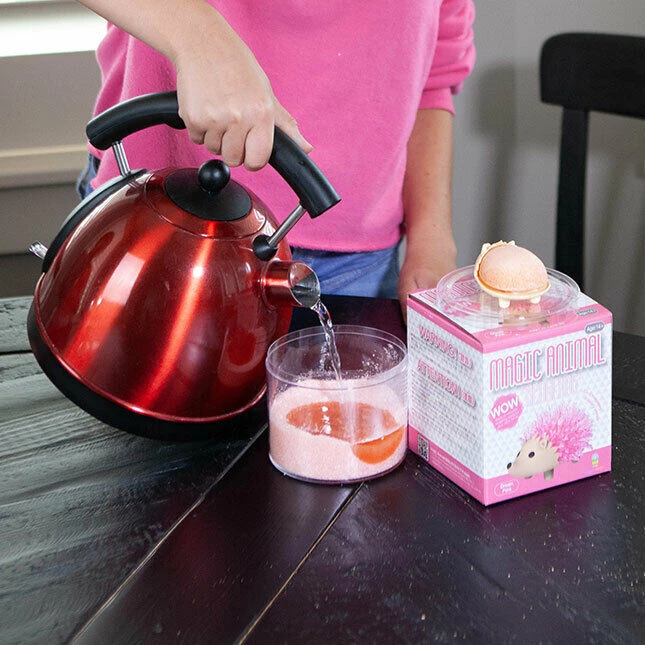 Following the detailed instructions, young scientists simply mix the special solution into a container of boiling water and then set the poor, spineless hedgehog into the mixture.