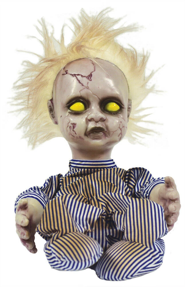 Scary dolly is having a temper tantrum, with arms and legs kicking, and lots of crying! Dolly sits up crying, then throws itself on its back, kicking and crying, then sits up again, repeating the pattern. You have to see to believe! Wild blonde hair tops a cracked face with yellow eyes, and the baby is wearing a striped dirty onesie. Amazing spooky effect! Soft 11-inch tall doll uses 3 AA batteries. Arm button activation.