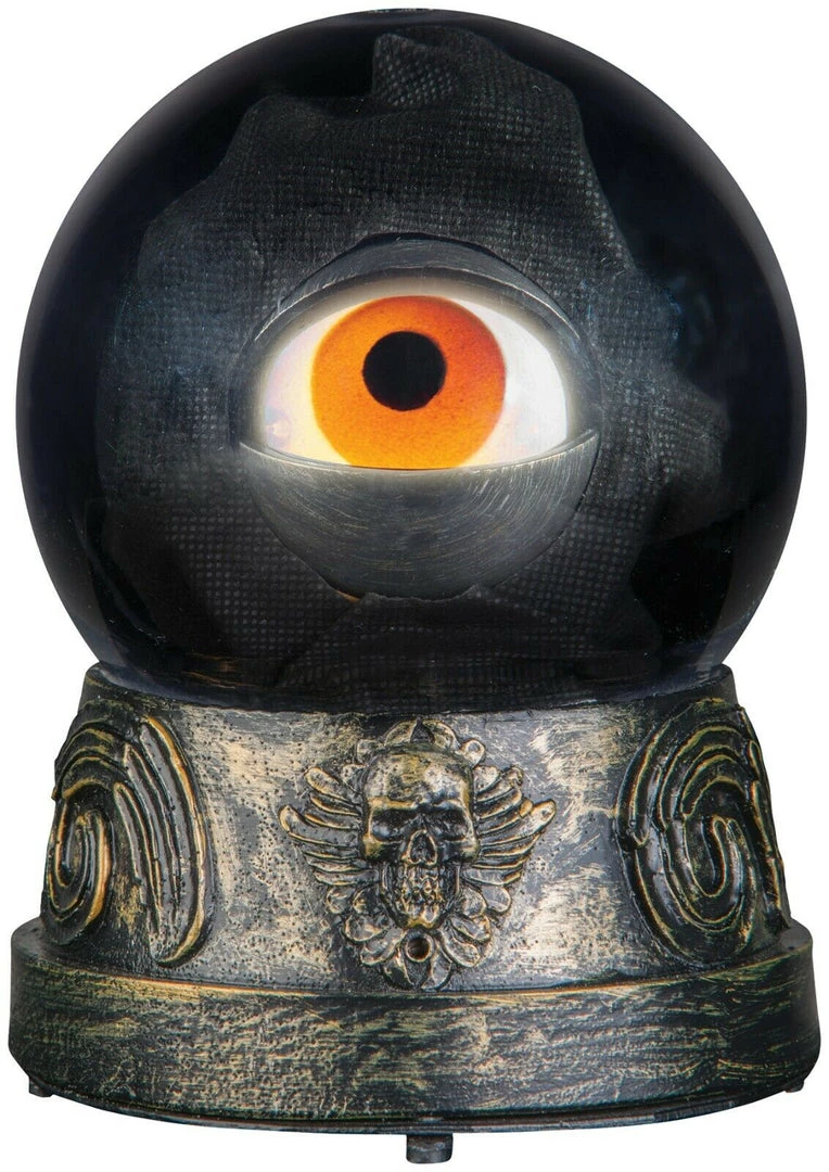 Here is looking at you! Crystal ball on pedestal with eyeball inside that blinks and looks from side to side. Try me and motion detector included Requires 3-AAA batteries. Measures 6 inches x 5 inches x 5 inches. Comprised of 75% Plastic, 15% Electronics, 10% Fabric.