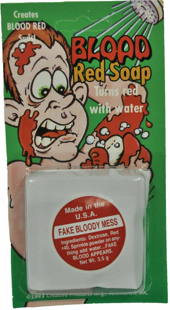 Halloween party trick of a cake of soap that lathers like normal soap when water is added but becomes a bloody mess and makes a scary Halloween prop.ย