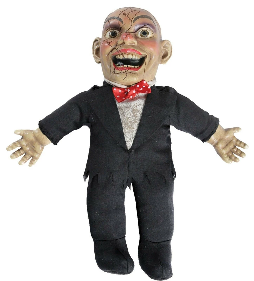 This Jolly little doll has a wicked side that you can only get to know from bringing him home with you. Give him a new home…if you dare! Charlie features sound-activated or push-activated sounds, rigid PVC head & hands with a stuffed body & feet. Says one of three 5-second sound files with activation ( How’d you like it if I made YOU talk, huh? (laughs), Sticks and stones will break your bones…Hey, that’s not a bad idea! (laughs). , Hey, easy where you put your hand, pal – we only just met! The last one to get fresh with me is sleeping it off – SIX FEET UNDER! (Laughs). )ย
