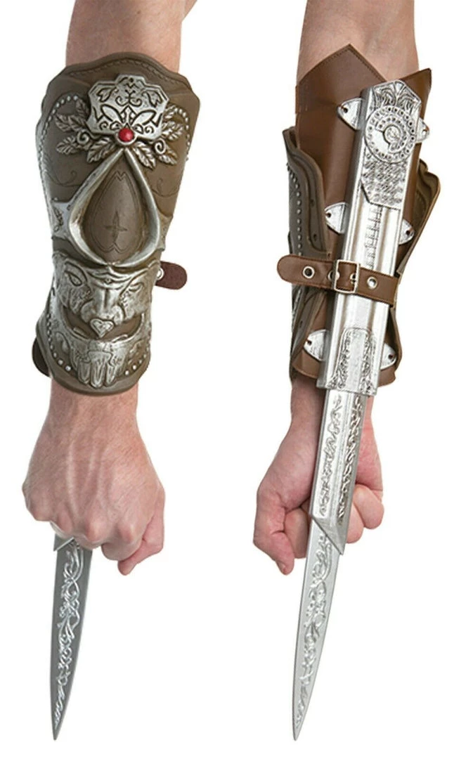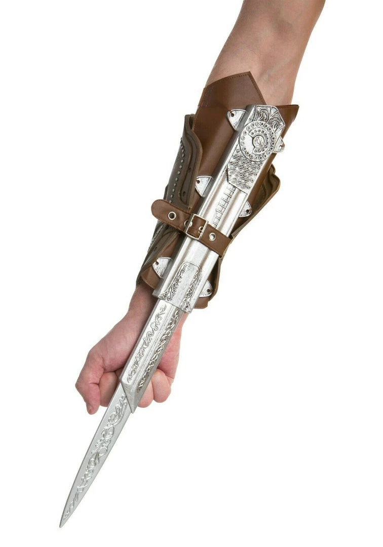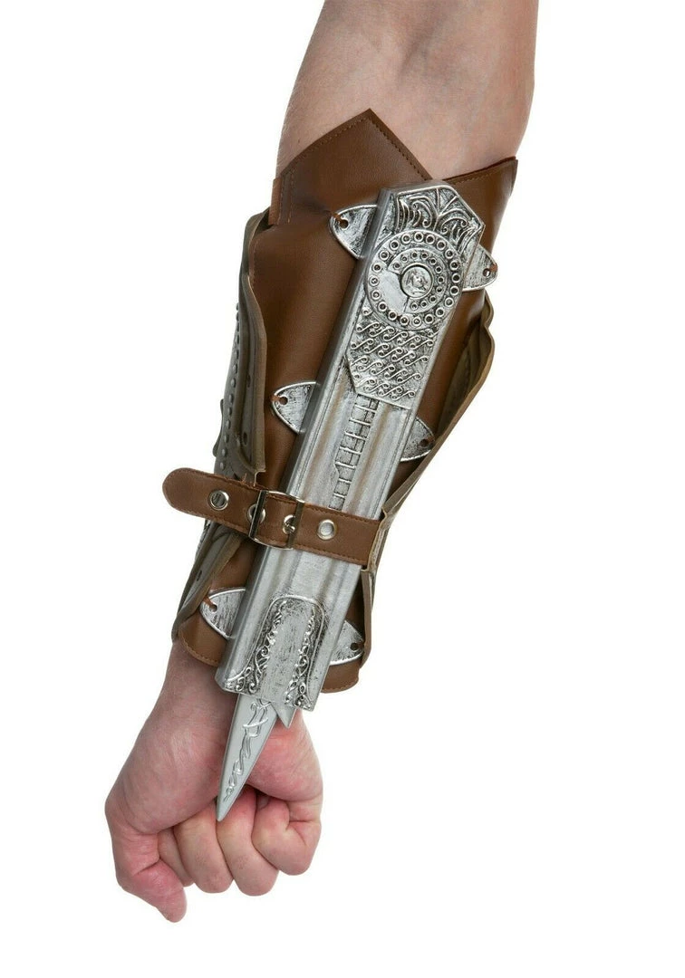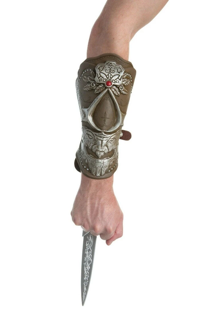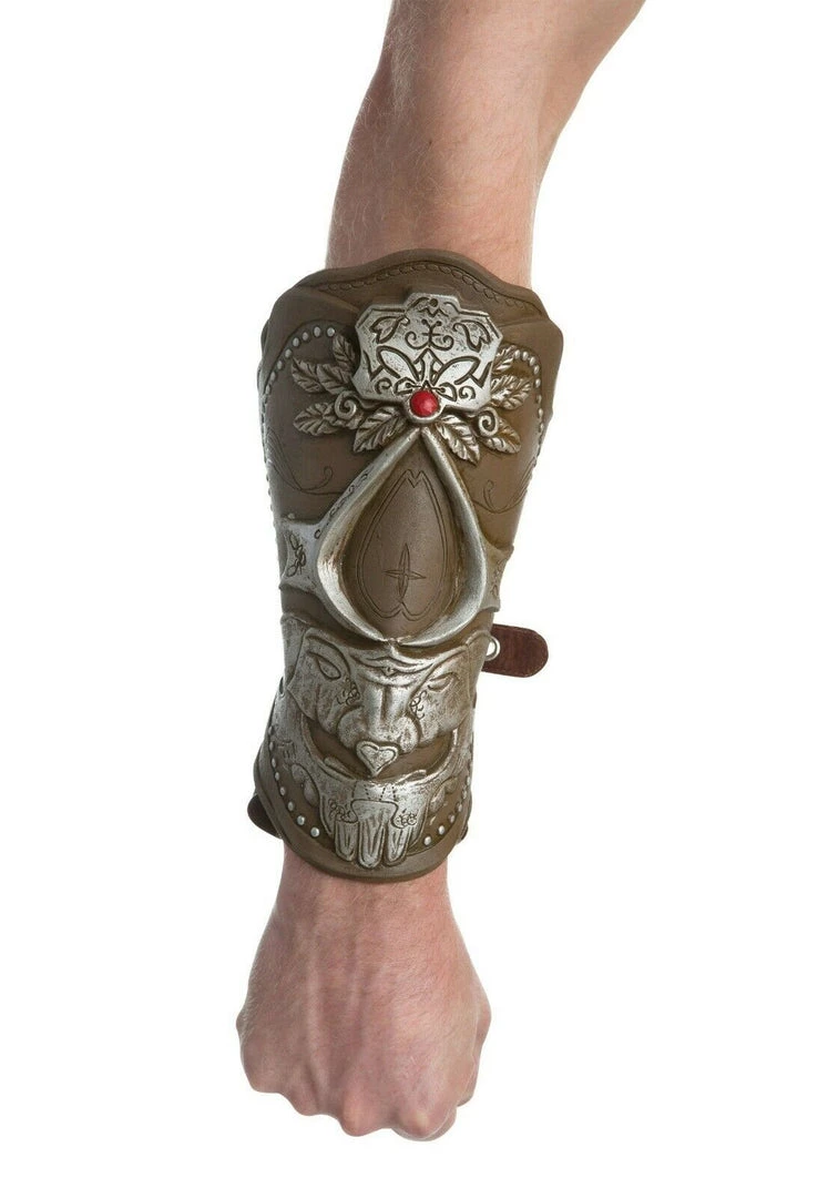 This Assassin’s Creed gauntlet is made from faux-leather and ornately decorated with silver and a red stone. Hidden on the underside of the gauntlet is an extendable silver blade. Great accessory for your Ezio costume! Blade is made of safe plastic. This is an officially licensed Assassin’s Creed accessory.