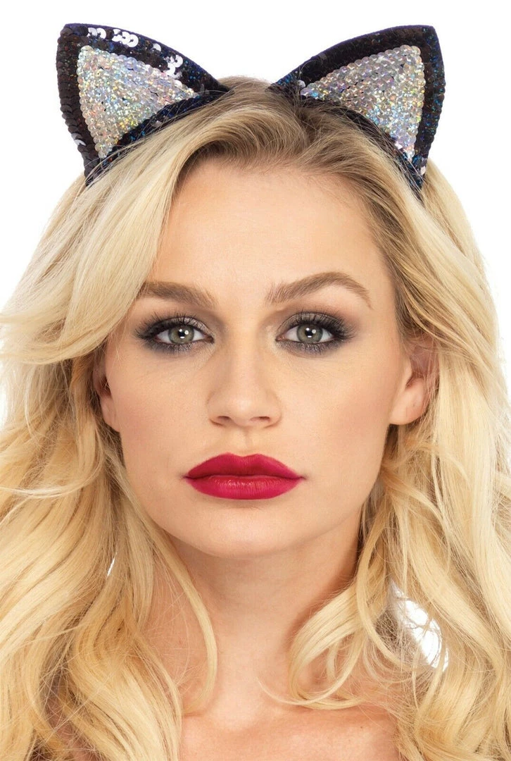 Add some sparkle to a traditional cat costume with these silver sequin cat ears with black sequin outlines! Meow! Ears are attached to a headband. One size fits most.