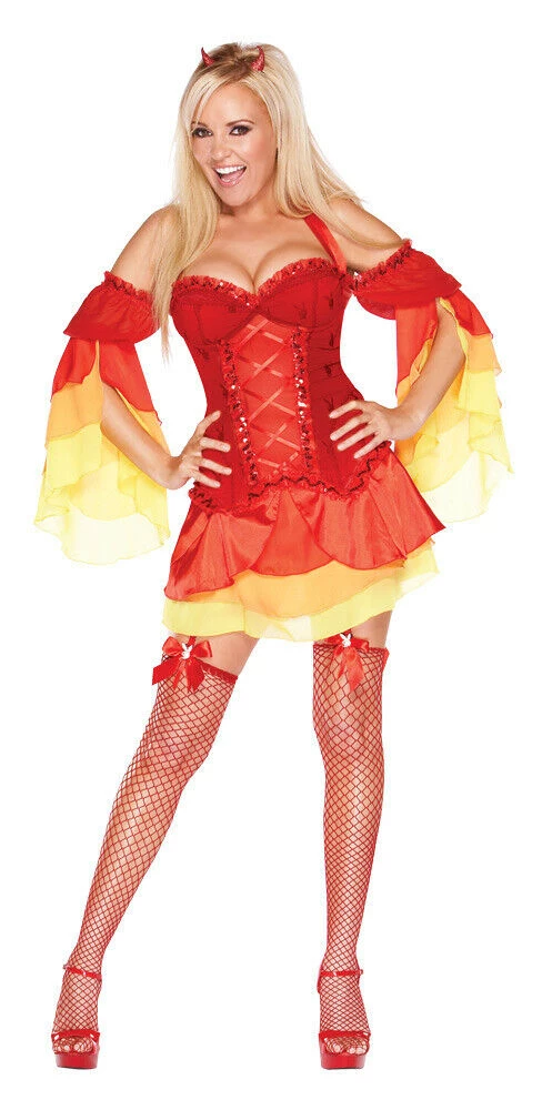 This sexy Playboy devil costume includes a corset dress, matching sleevelets and fishnet stockings. Playboy Rabbit Head embroidered gossamer corset dress with tiered, organza ruffled skirt and matching sleevelets. Fiery, sparkling clip-on horns, red fishnets with rhinestone accent garters.