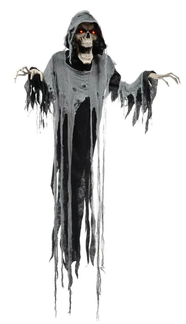 This 72-inch (183cm) Hanging Reaper life-sized prop has blow-molded elongated head and hands with poseable arms light-up eyes and a tattered costume with hood and gauze details! There is a motion-sensor activation for the sounds he speaks and the sounds have a volume control. Great for your Halloween party or setting! He says: Your Soul Is Mine… Ha ha ha ha!