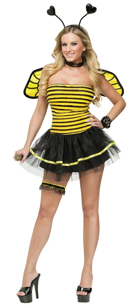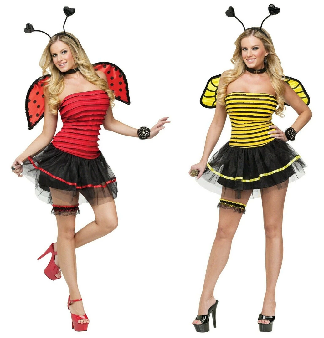 Two sexy costumes in one! These Bumble Bee/Lady Bug costume includesΒ Cute strapless dress has tulle skirt with under layer.Β Includes precious heart antenna headband and polka dot wings.