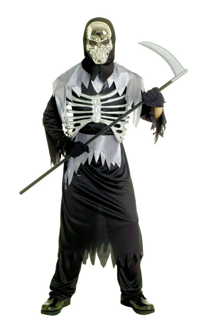 From the Demons of Metal collection. Metallic mask, robe with hood, rib cage, and white shoulder sash. Adult large 42-44.