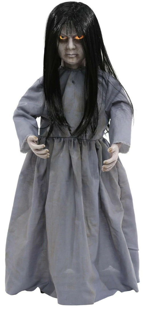 Standing at 32″ tall, this static dreadful doll prop has fade-on/off light-up eyes and says one of three 9-second phrases with each activation of her motion/light sensor (While you stayed away, I could tolerate you. Now that you are here you better be afraid!, Crows and maggots picked at my flesh, not fun. It is an experience I hope to share with you., Your living happiness sickens me. Hell hath no fury like a little girl scorned.) Perfect addition to any haunted house.ย