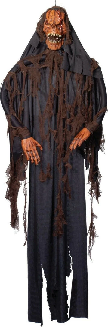 Perfect for a haunted house. Hanging pumpkin-headed ghost draped in black robe and gauze. 6 foot tall.