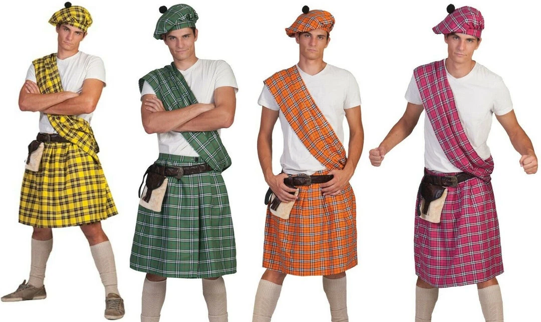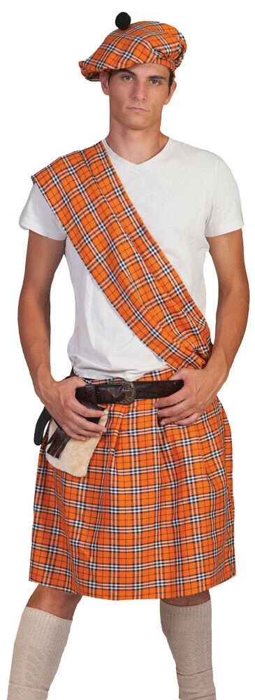 Great quick Scottish look! Plaid kilt comes with matching sash, hat with pom-pom, and belt with pouch. Just add your own white T-shirt, or do without and show off those abs! One size fits most men sizes 40-44.