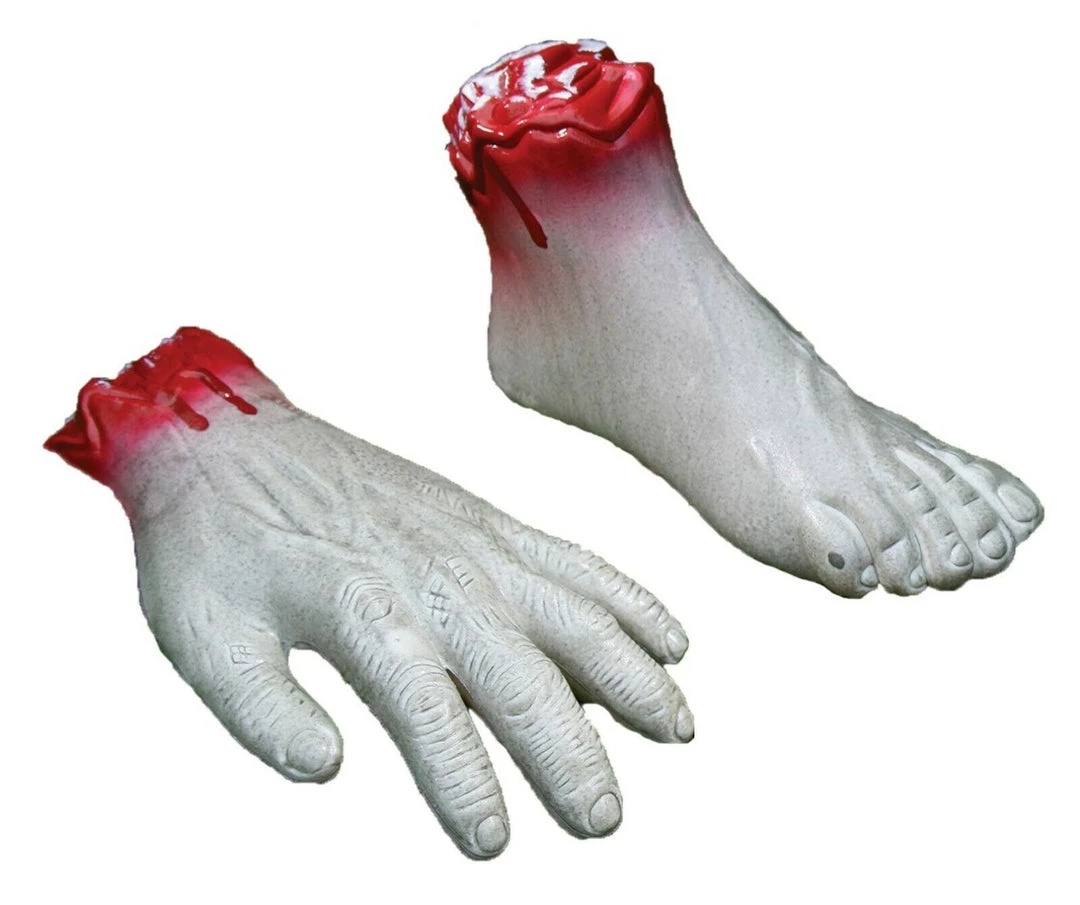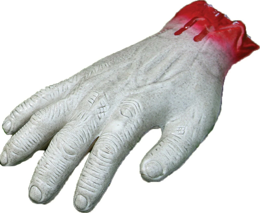 White zombie hand with blood near the wrist is perfect for any haunted display and gives the distinct impression zombies have been lurking nearby. 100% Polypropylene.