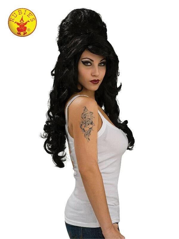 - Wig is wavy with high beehive bun styled on top plus side fringe