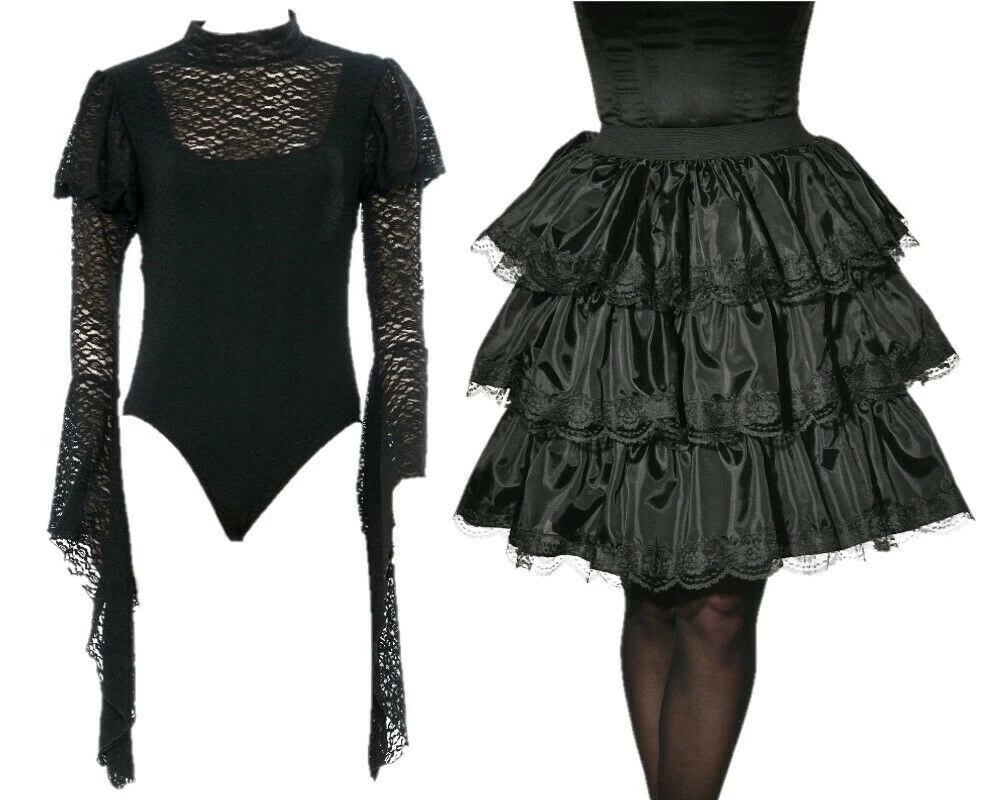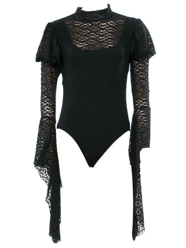 - Bodysuit has feature lacy high neckline plus lacy sleeves with long draped pieces