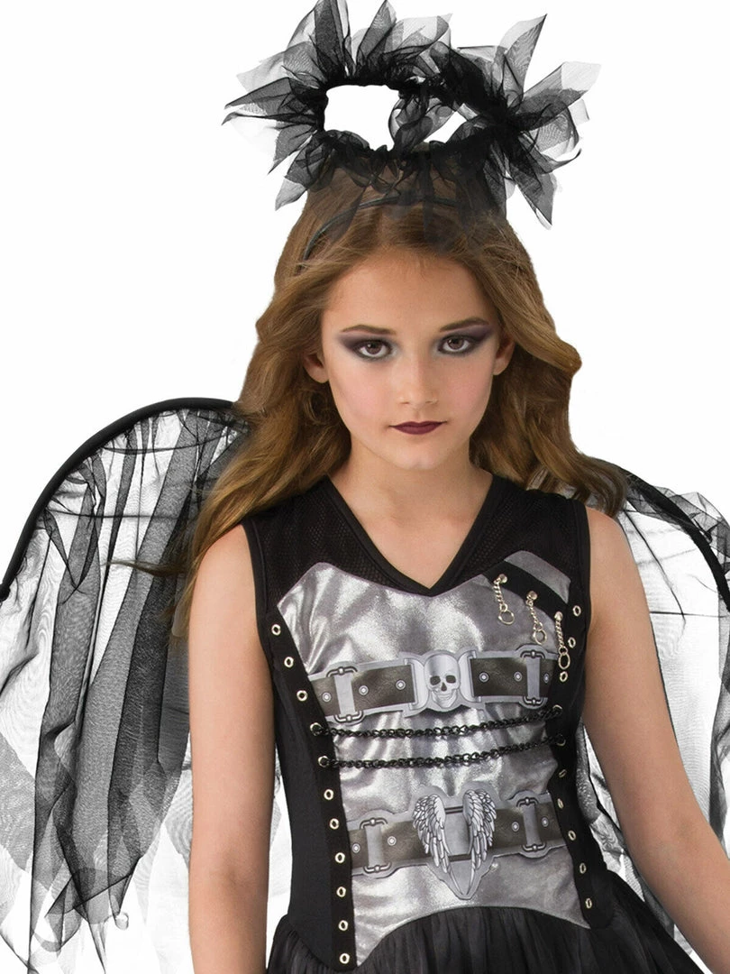 - Droopy and ragged edge black mesh wings are on a wire frame and attach to the dress with velcro tabs