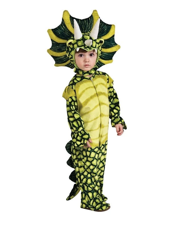 - Jumpsuit features a detachable plush head with fibre filled 3D dinosaur facial features and triceratops frill feature