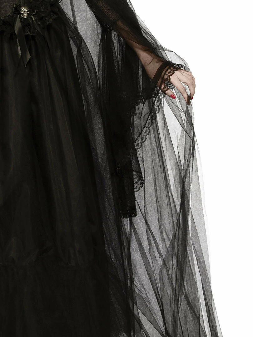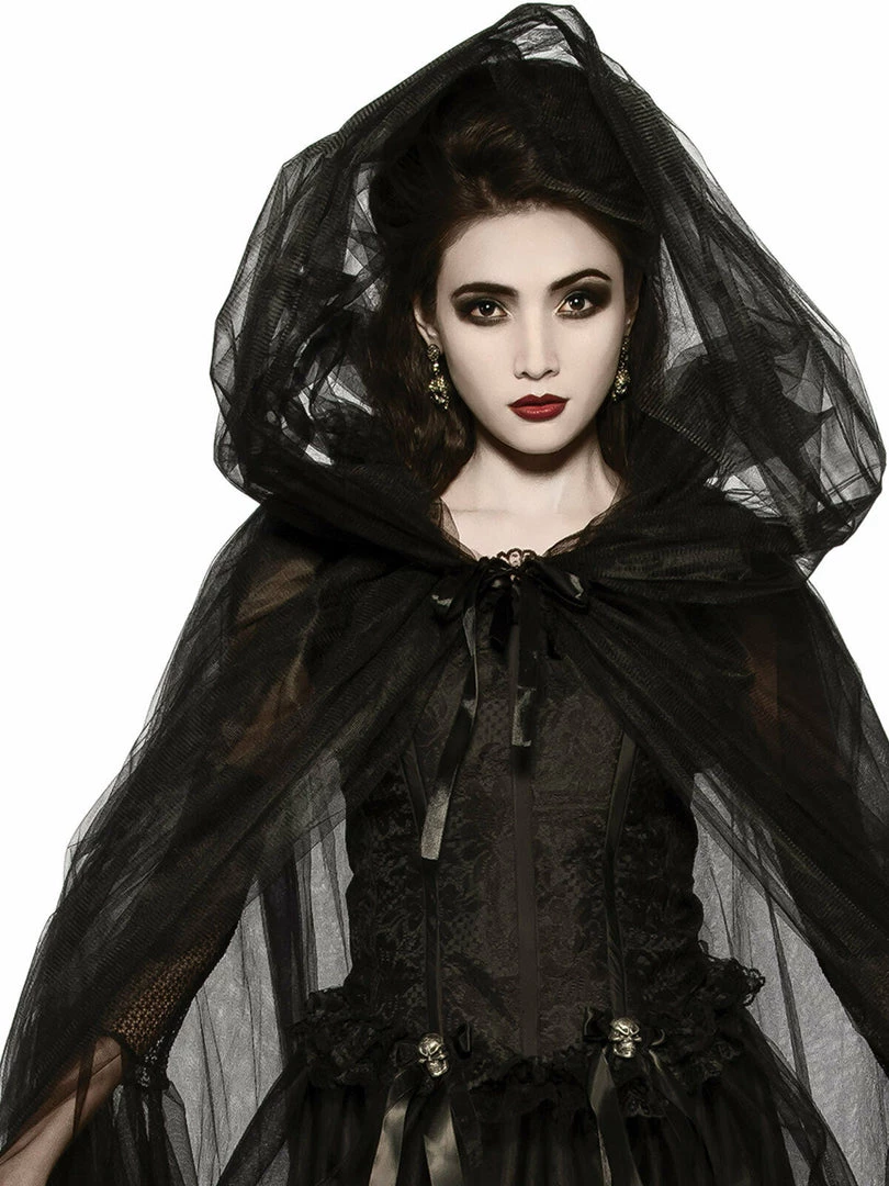 - Cape is sheer black and features a broad hood and satin tie at front of collar to adhere