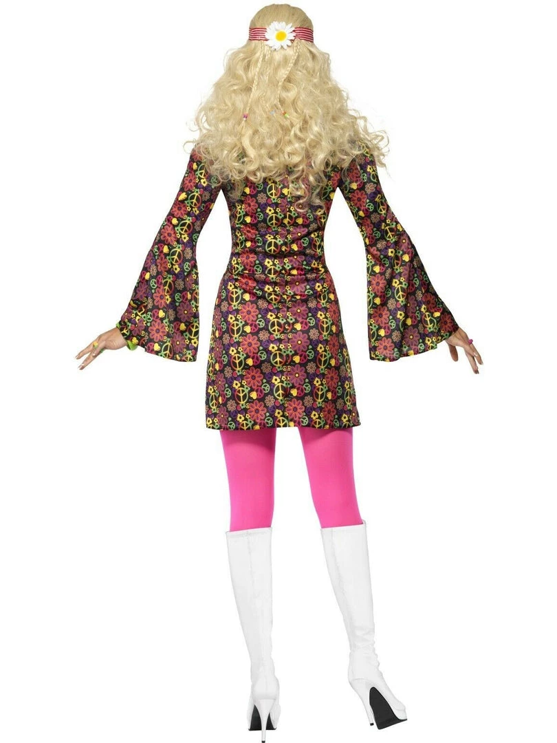 This psychedelic costume includes a peace symbol printed dress with detailed swooping bell sleeves.
