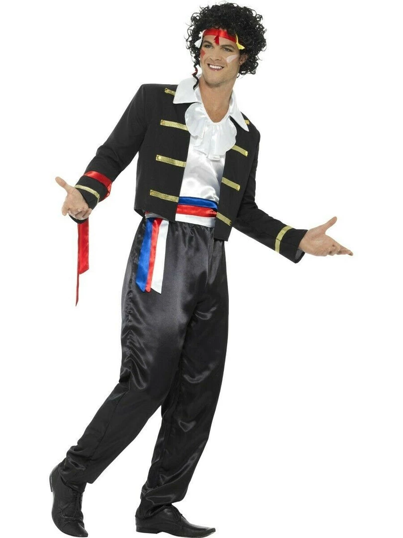 Take the centre stage and show off your talent as a 1980’s pop star for your next fancy dress party when you wear this Adam Ant costume for men! Get ready to strut your stuff in this men’s black 80’s New Romantic fancy dress outfit by Smiffy’s, perfect for some disco or pop dancing!