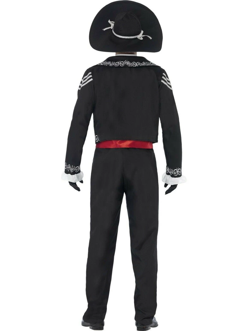 - Costume is complete with a pop up padded foam black hat with wide wire edged brim, silver braid trim and white sugar skull print.