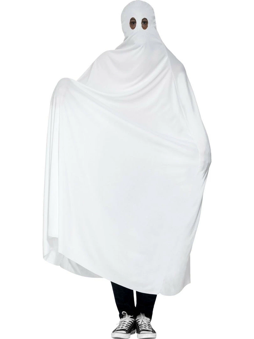 - ย Ghost costume has an attached hood with cut out eyes with black
