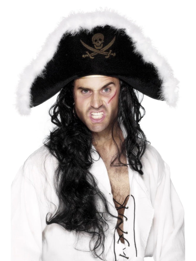 Dust off your cutlass it’s time to set sail in this affordable adult’s black pirate hat with feathers. Great quality sideways pirate costume hat, a cool swashbuckling pirate costume accessory!
